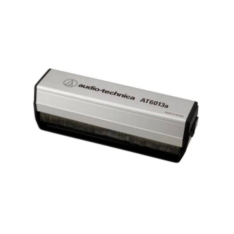 El limpiador de discos AT6013a ofrece una limpieza de doble acción que prolonga la vida útil de sus discos y agujas, y mejora su experiencia auditiva. El limpiador consta de dos cepillos de fibra de carbono, situados a ambos lados de una almohadilla central de terciopelo, que trabajan en conjunto para recoger el polvo y otros contaminantes en una sola pasada sobre el disco. Las fibras antiestáticas del cepillo se mantienen rectas para una limpieza profunda del surco del disco. Incluye un soporte protector metálico para proteger los cepillos y la almohadilla cuando no se utilizan.