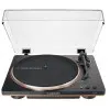 El AT-LP70X también cuida los detalles prácticos que marcan la diferencia. Su chasis antirresonante ayuda a reducir vibraciones no deseadas, y su adaptador de corriente externo minimiza interferencias, logrando un sonido más limpio. Disponible en acabados elegantes como negro/gris o negro/bronce, incluye accesorios esenciales como un cable RCA desmontable, adaptador para discos de 7″ y una cubierta antipolvo con bisagras. La AT-LP70X es la tornamesa de entrada que no sacrifica estilo ni funcionalidad, perfecta para dar el salto al fascinante mundo del vinilo.