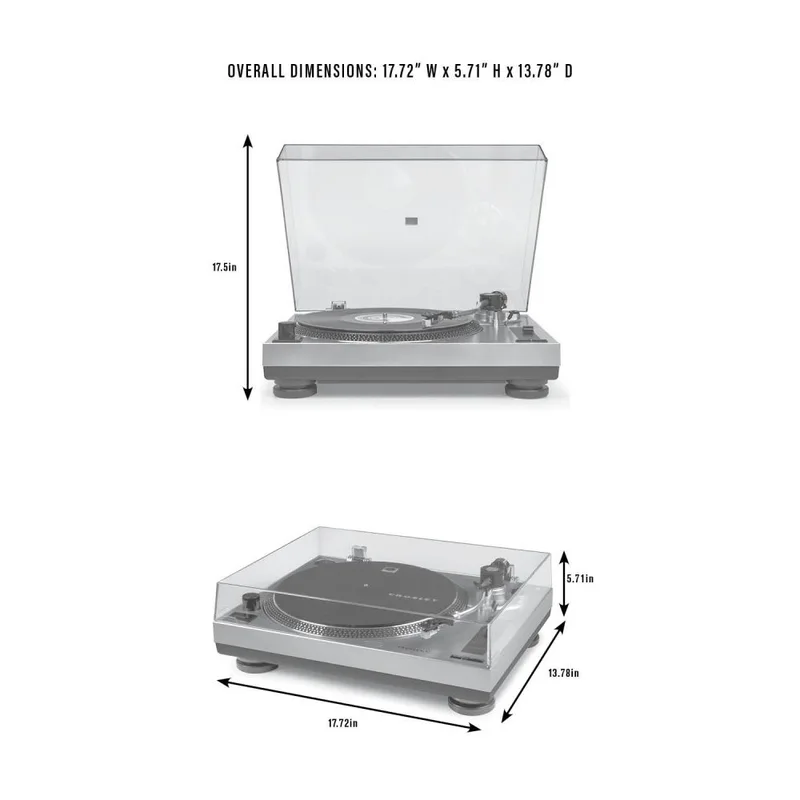 - Tocadiscos de dos velocidades con transmisión por correa: Reproduce discos de 33 1/3 y 45 RPM e incluye un tapete antideslizante de 12 pulgadas y un adaptador para discos de 45 RPM. El plato estroboscópico de aluminio y el control de tono ajustable ofrecen una velocidad de reproducción precisa.