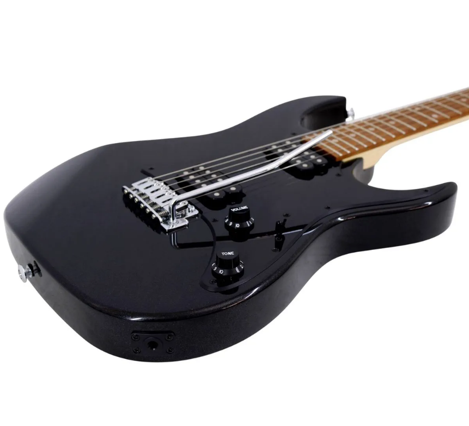 La guitarra presenta un cuerpo de Agathis/Basswood que proporciona un tono equilibrado, con buena respuesta tanto en frecuencias graves como agudas. Su mástil de arce (Maple) y diapasón de palo de rosa (Rosewood) ofrecen una sensación cómoda y rápida, ideal para practicar acordes, riffs y solos. Con una escala de 25.5 pulgadas y 22 trastes, se mantiene fiel a la sensación clásica de las guitarras de estilo Stratocaster.