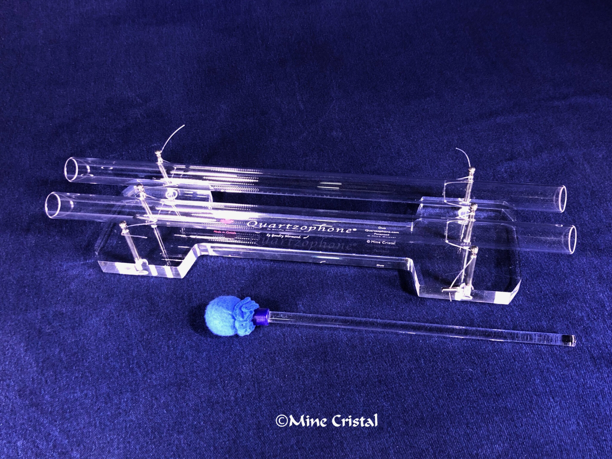 El Quartzophone Duo cuenta con dos tubos de cuarzo puro perfectamente combinados. Están montados sobre una base acrílica con dos cuerdas continuas en zigzag y sujetos a delgados pasadores de metal, manteniendo los tubos perfectamente centrados. Hay tornillos o llaves para ajustar la tensión. Este sistema único y patentado permite una oscilación libre y un sostenido prolongado, creando tonos puros, resonantes y potentes.
